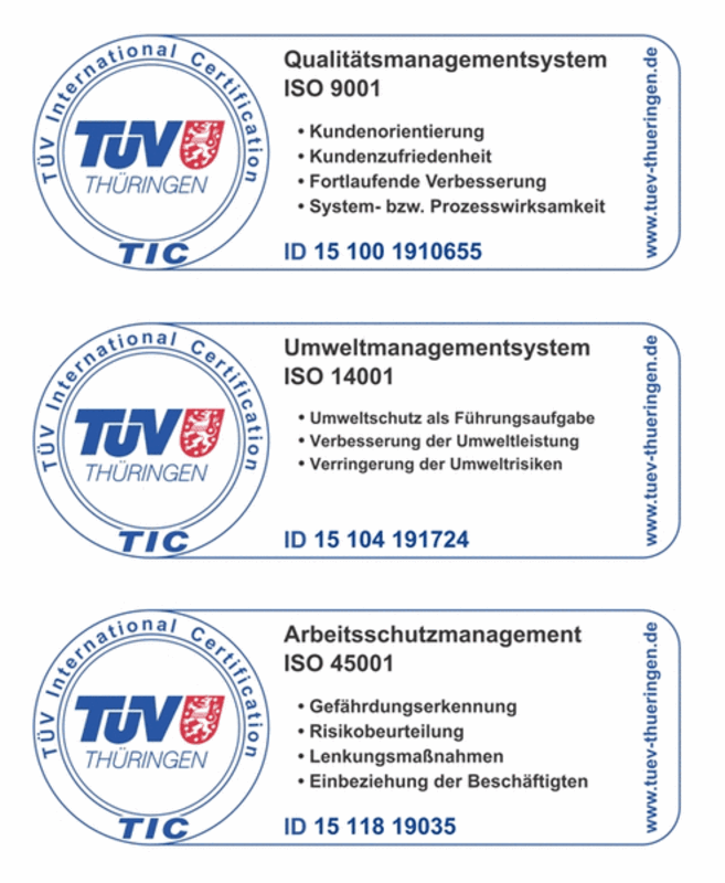 Die HAPILA GmbH hat mit der Zertifizierung nach DIN ISO einen weiteren wichtigen Meilenstein zur Sicherung eines hohen Qualitätsniveaus ihrer angebotenen Dienstleistungen und Produkte erreicht. Der TÜV Thüringen e.V. hat für das bestehende Integrierte Managementsystem die Konformität für die Normen DIN EN ISO 9001: 2015 Qualitätsmanagementsysteme sowie DIN EN ISO 14001: 2015 Umweltmanagementsysteme und DIN ISO 45001: 2018 Managementsysteme für Sicherheit und Gesundheit bei der Arbeit festgestellt.